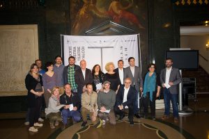 L’alcalde d’Alcoi, Antoni Francés, el director de la Mostra, Miquel Santamaria i representants de les companyies de teatre valencianes han acompanyat Girona en la presentació al Teatre Principal de València